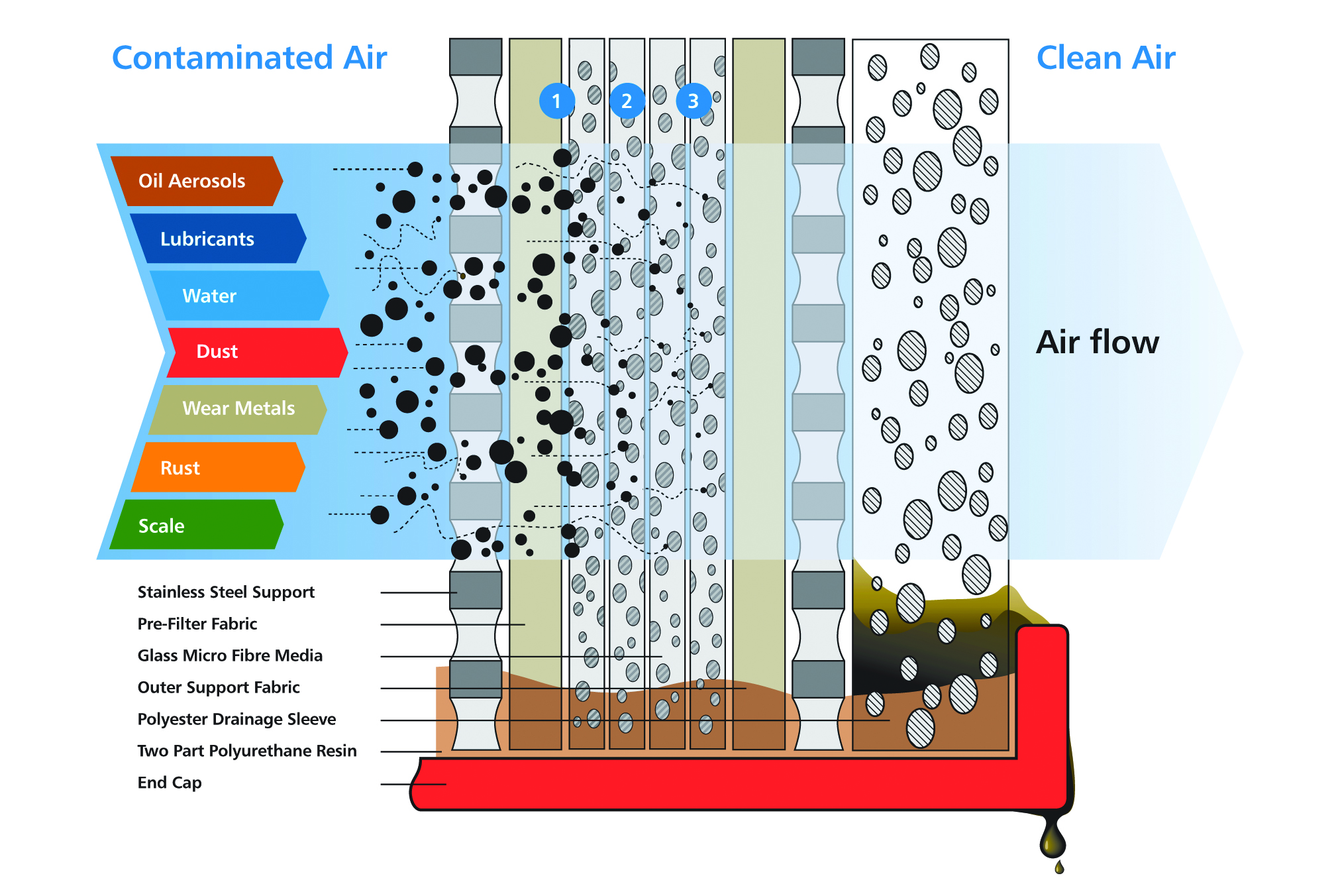 汚れた圧縮空気 : 圧縮空気は、空気中のありとあらゆる物質のカクテルで、いろんな不純物が含まれています。エアゾール状の油粒子、コンプレッサーの潤滑油が混じったドライヤーや配管系統で結露したドレイン水、ダスト、金属の摩耗片、錆、パイプスケール等がフィルターに流れ込みます。