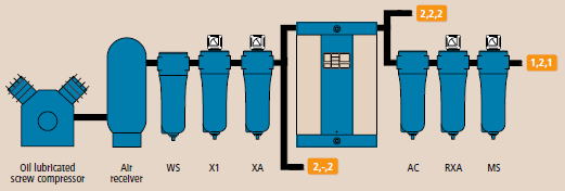 Walker Filtration社の各グレードのフィルターを使用した場合の圧縮空気の品質